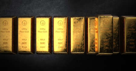 Shiny pure gold bars in a row background. Wealth and economic concept. Business gold future investment and money saving theme. 3D illustration rendering