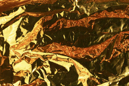 Gold background. Texture of crumpled yellow or gold metallic color with harsh light. Foil with creases close-up.