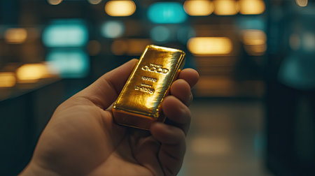 A hand holding a single gold bar, showcasing its weight and value, with a blurred background of a financial market or trading floor.