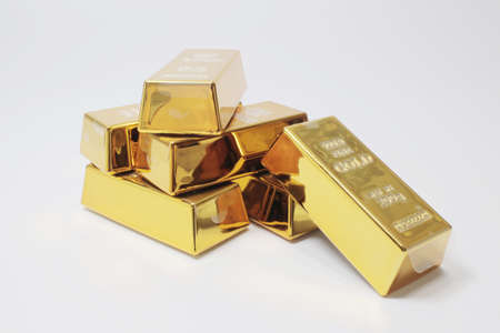 Gold bullion on a white background with shallow depth of field.