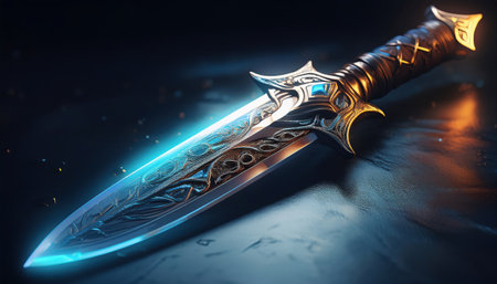 A close-up image showcases a futuristic dagger, rendered with detailed craftsmanship. The weapon features neon blue glowing accents against a dark background, creating a stark contrast. The composition highlights the sharp blade and intricate design elements. Suitable for various creative and illustrative applications, potentially for digital art or fantasy-themed projects.