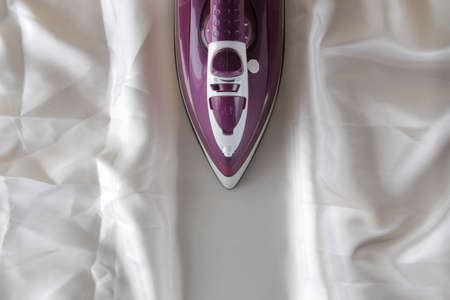 Lilac iron on a piece of white crumpled fabric. ironing clothes. household electrical appliances. view from above.