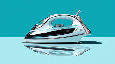 A sleek modern iron rests on a reflective surface against a vibrant aqua backdrop, capturing the essence of contemporary appliance design and home utility.
