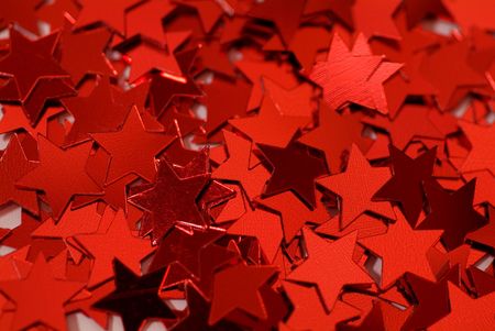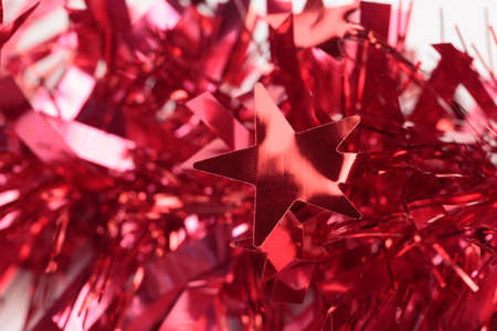 Red Christmas tinsel with stars. It occupies the entire surface of the image. Close-up.