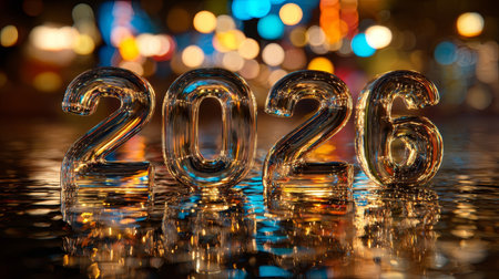 A striking image of transparent numbers 2026 set on a shiny surface, surrounded by colorful bokeh lights, symbolizing celebration and anticipation for the new year.