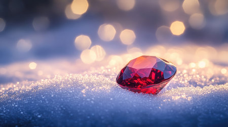 A stunning red gemstone rests gracefully on a bed of snow, accentuated by soft bokeh lights creating a magical winter atmosphere of elegance and beauty.