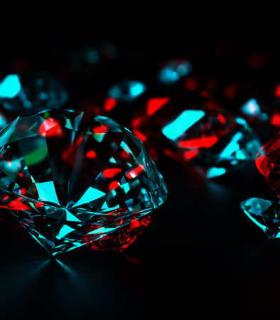 A stunning close-up of a crystal diamond displaying rich red reflections. The textured black background adds depth, enhancing the elegance and luxury of the scene.