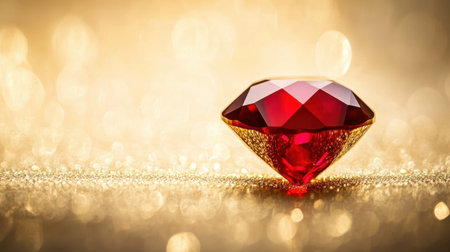 A stunning red gemstone with intricate facets rests on a shimmering surface, surrounded by a dreamy golden bokeh, creating a luxurious and elegant atmosphere.