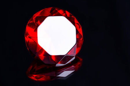 A stunning red gemstone displaying brilliant cut facets, reflecting light beautifully on a dark surface. Ideal for luxury themes in design and art.