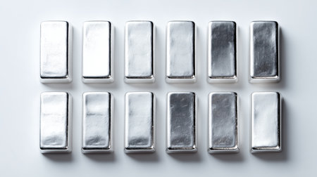 Silver bullion bars arranged neatly with metallic shine
