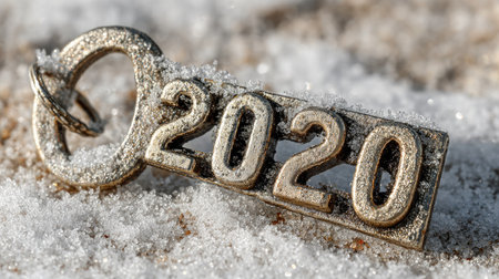 A decorative keychain featuring the number 2020 rests on a snowy surface, capturing the essence of winter and the fresh start of a new year.