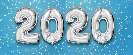 Flat lay 2020 inflatable silvery numbers with confetti in the shape of stars on blue background. New year winter decoration, holiday symbol, party item. Merry Christmas greeting card. Happy New Year.
