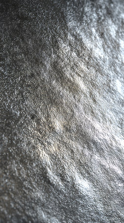 Extremely close shot of silver-colored surface featuring a very granular and textured appearance. The light reflects unevenly, creating areas of shine and shadow, enhancing the texture.