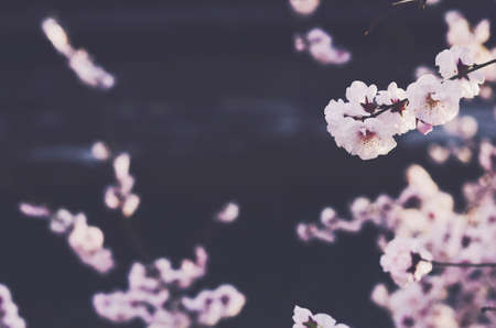 Closeup of spring blossom flower on dark bokeh background. Macro cherry blossom tree branch. Blooming springtime orchard landscape scene. Beautiful easter wallpaper design.
