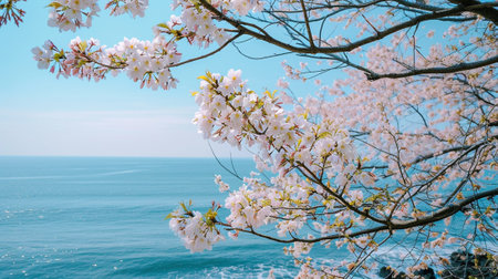 Horizontal shot of Sakura blossoms in bloom over a backdrop of sea