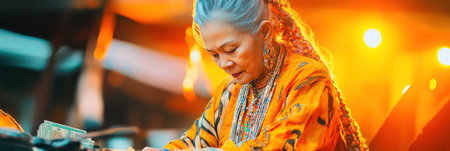 An indigenous artist paints a colorful tribal design with focus and emotion, dressed in vibrant attire. The background is partially transparent.