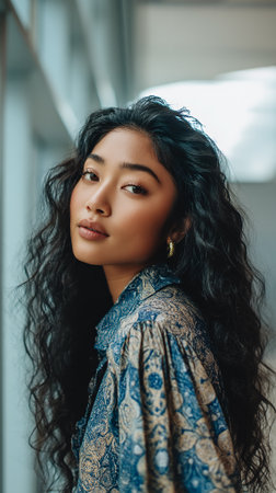 A woman stands calmly in a brown outfit, her long dark hair flowing elegantly. She gazes directly at the camera, showcasing her confident expression in a simple yet stylish setting.
