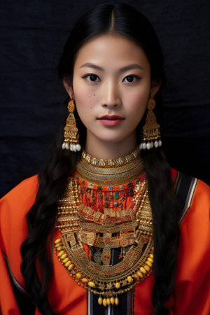 Beautiful asian woman in traditional costume with jewelry on dark background