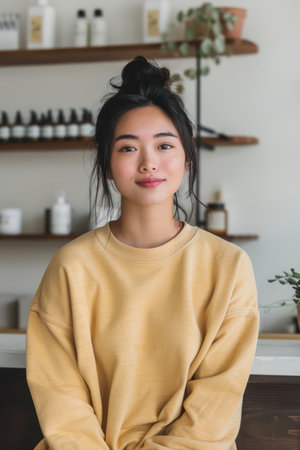 Portrait of a Young Woman in Casual Yellow Sweater with a Serene Expression in a Modern Home Interior AI Generative