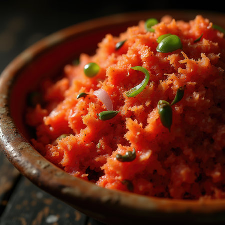 A vibrant dish of carrot halwa, showcasing grated carrots, nuts, and spices, served in a rustic earthen bowl and garnished with fresh green chilies and onions.