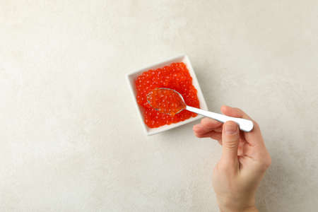 Female hand hold spoon in bowl with red caviar on white textured background