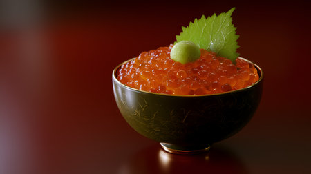 Glossy salmon roe in gold-detailed bowl with green garnish. Rich red backdrop and elegant plating evoke tradition, luxury, and Japanese culinary artistry.