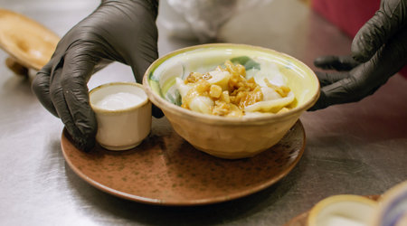 Culinary work. Serving meal. Chef adding sour cream to dumpling with fried cracklings on kitchen table. Hands preparing traditional dish.