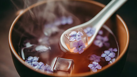 Flowers in a cup of tea with ice on a wooden background