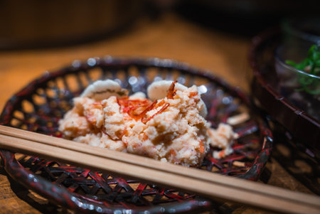 Kyoto close up of okara style salad in woven basket with chopsticks