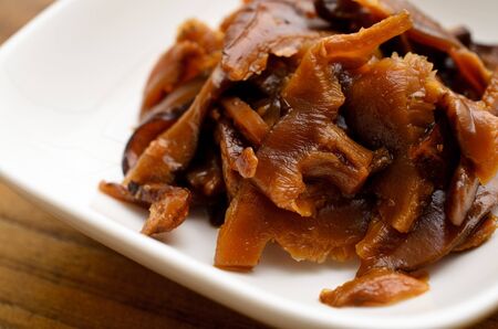 Japanese Food Chinmi Chuka Idako Seasoned Baby Octopus, Closeup on Wooden Table