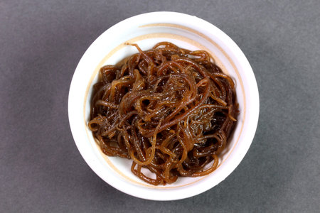 A mozuku seaweed placed on a black background.Mozuku is an Okinawan delicacy. It is a kind of dark, thread-like seaweed seasoned with vinegar