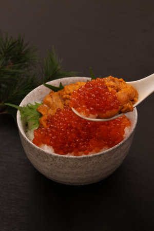 Japanese Food: Sea urchin and salmon roe topped on the rice bowl (Uni and Ikura Don)