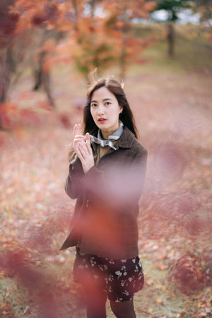 A southeast asian woman travel autumn park wearing jacket and scarf standing outdoors with thoughtful expression surrounded by colorful leaves and nature