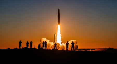 Large missile launching vertically with a brilliant fiery exhaust plume, silhouetted against a vibrant orange and blue sunset sky, observed by a silhouetted crowd.