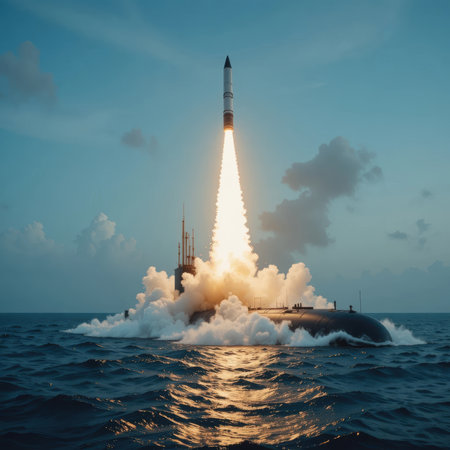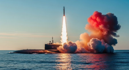 Large dark grey submarine partially submerged in the ocean, launching a ballistic missile with a powerful fiery explosion and dense smoke rising into the sky, symbolizing military power and defense.