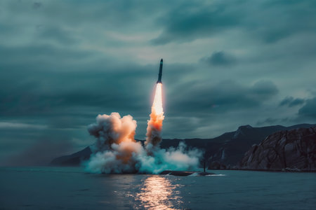 Vibrant ballistic missile launch with fiery engines blazing casting a dramatic plume of smoke in the dusky sky