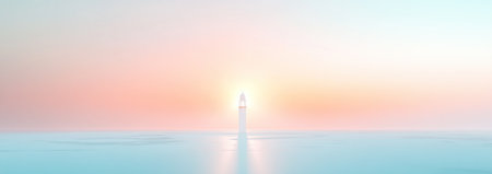 A rocket launches at night, leaving a bright trail in the sky. The calm waters reflect the vibrant light, creating a stunning scene of technology and nature.