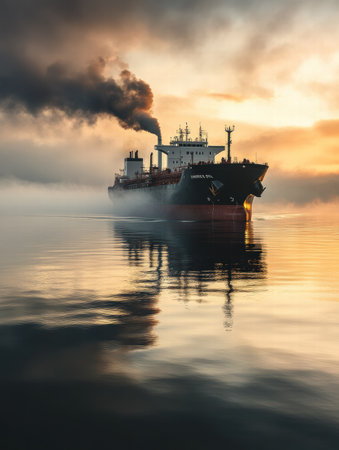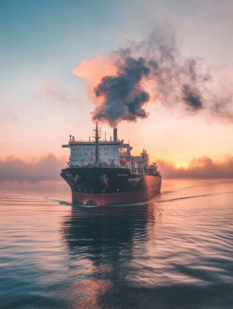 A massive oil tanker navigates tranquil ocean waters at sunrise, with smoke billowing from its chimneys against a colorful sky.