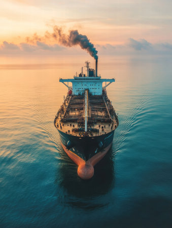 A massive oil tanker glides smoothly across tranquil ocean waters, emitting smoke from its chimneys as the sun sets on the horizon.