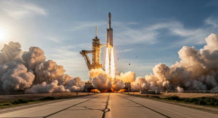 A powerful rocket lifts off from the launch pad, surrounded by billowing smoke and flames, marking the start of an incredible journey into space.