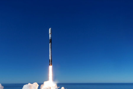 A powerful rocket ascends against a clear sky, representing innovation and ambitious growth in the business landscape.