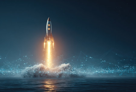 A rocket ship blasts off from the ocean surface, creating a trail of fire and smoke. The composition features a low-angle perspective with the ship centered. The image uses a dark blue color palette, and the water adds a textural element. This scene is suitable for use in concepts about space, technology, and future endeavors.