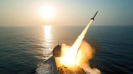 A warship is seen launching a missile as the sun sets on the horizon, highlighting the power of naval operations during a military exercise in the ocean.