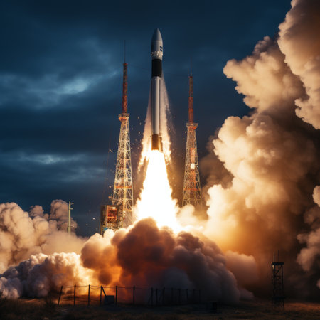 A powerful rocket ascends through the twilight, illuminating the dark sky as it breaks free from the launchpad, leaving a trail of smoke and fire.