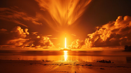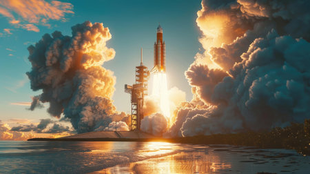 Launch of a Rocket During Sunset Over the Ocean Showcasing Powerful Propulsion and Atmospheric Effects Generative AI