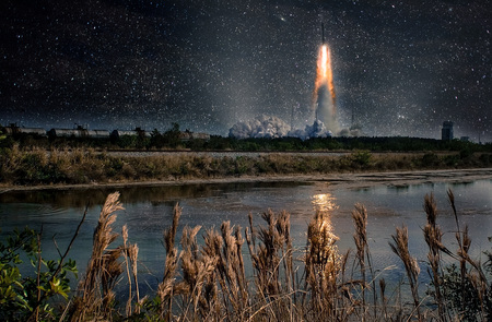 Missile launch at night. Tranquil nature landscape and reflection in the creek.