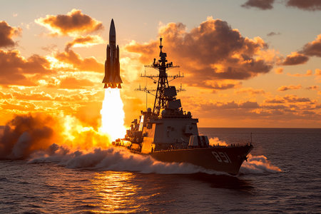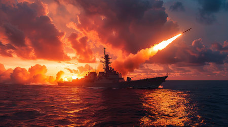 A warship launching a missile during a dramatic sunset at sea, highlighting military power and a picturesque sky