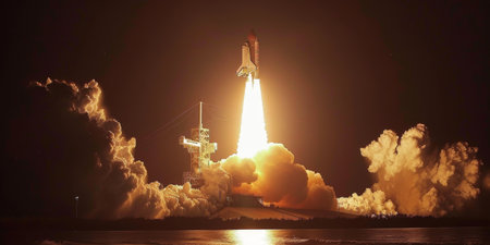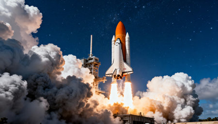 A space shuttle blasts off from its launchpad, engines firing with immense power, creating clouds of smoke against a dark, star-filled sky.
