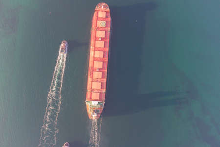 The dry cargo vessel enters the port with the help of tugs. Photo from a helicopter. Bird's-eye view