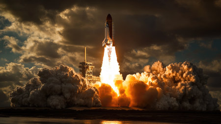 A powerful space shuttle launch, blazing into the sky amongst monumental clouds at sunset, depicting innovation and exploration